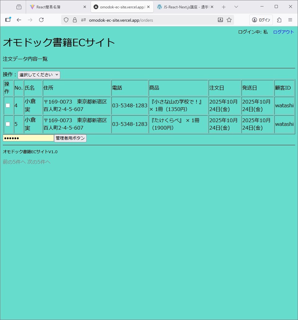 | 講座内容 | 1.初心者向け予習セクション10回 上記「初心者向けMERN-React25回講座」と同じ。 2.Ajax・fetchセクション5回 上記「初心者向けMERN-React25回講座」と同じ。 3.MERNスタック-Reactセクション10回 上記「初心者向けMERN-React25回講座」と同じ。 4.Next.jsの基礎練習4回 Next.jsの基礎練習ではReact講座で作成した「React簡易名簿」をReactと共通の「Page Router」版に修正し、さらにNext.jsオリジナルの「App Router」版に修正していきます。このときSEO対策に強いと言われる アクセス時にHTML化する「SSR」や、ビルド時にHTML化する「SSG」、定期的にHTML化する「ISR」 についても学び、最終的にExpressサーバー機能を「API Routes」に移行し、「Server Action」との連携によるフルスタックアプリの「NestJs簡易名簿」と「NextJs画像掲示板」を制作します。 5.書籍ECサイト制作セクション6回 Next.jsのリファレンス練習でよく登場する「ToDoアプリ」を1個作れるようになっても、いきなり大規模サイトは作れません。そこで複数アプリから成立するECサイト全体を作ることで、大規模サイト開発への足がかりとします。最終的に「買い物カゴ付き書籍ショッピングサイト」「Stripeカード決済機能付き書籍オーダーフォーム」「商品登録管理サイト」「発送日登録機能付き注文データ一覧サイト」の全機能を作成し、「MongoDB Atlas」と「Vercel」を使ってインターネット上に「デプロイ」し、動作確認を行います。 ◉「1.初心者向け予習セクション」で制作するもの Perlによる簡易名簿、JavaScriptによる各種ウインドウ操作、本日の日付表示、時間帯別テキスト表示、オンマウス、メニュー同期 ◉「2.Ajaxとセクション」で制作する応用アプリ JSON簡易名簿アプリ、JSON掲示板 ◉「3.MERNスタック-Reactセクション」で制作する応用アプリ *「ID:watashi、パスワード:wwwwww」でログインするとサンプルが見れます。 ユーザー認証機能付きReact簡易名簿 ◉「4.Next.jsの基礎練習1」で作成する応用アプリ ユーザー認証機能付きNextJs簡易名簿、NextJs掲示板、NextJs画像掲示板 *見た目は上記「JSON簡易名簿」「JSON掲示板」と同じ ◉「5.書籍ECサイト制作セクション」で作成する応用アプリ *「ID:watashi、パスワード:wwwwww」でログインするとサンプルが見れます。 買い物カゴ付き書籍ショッピングサイト、カート決済機能付きオーダーフォーム、ロール権限者向け商品管理サイト |