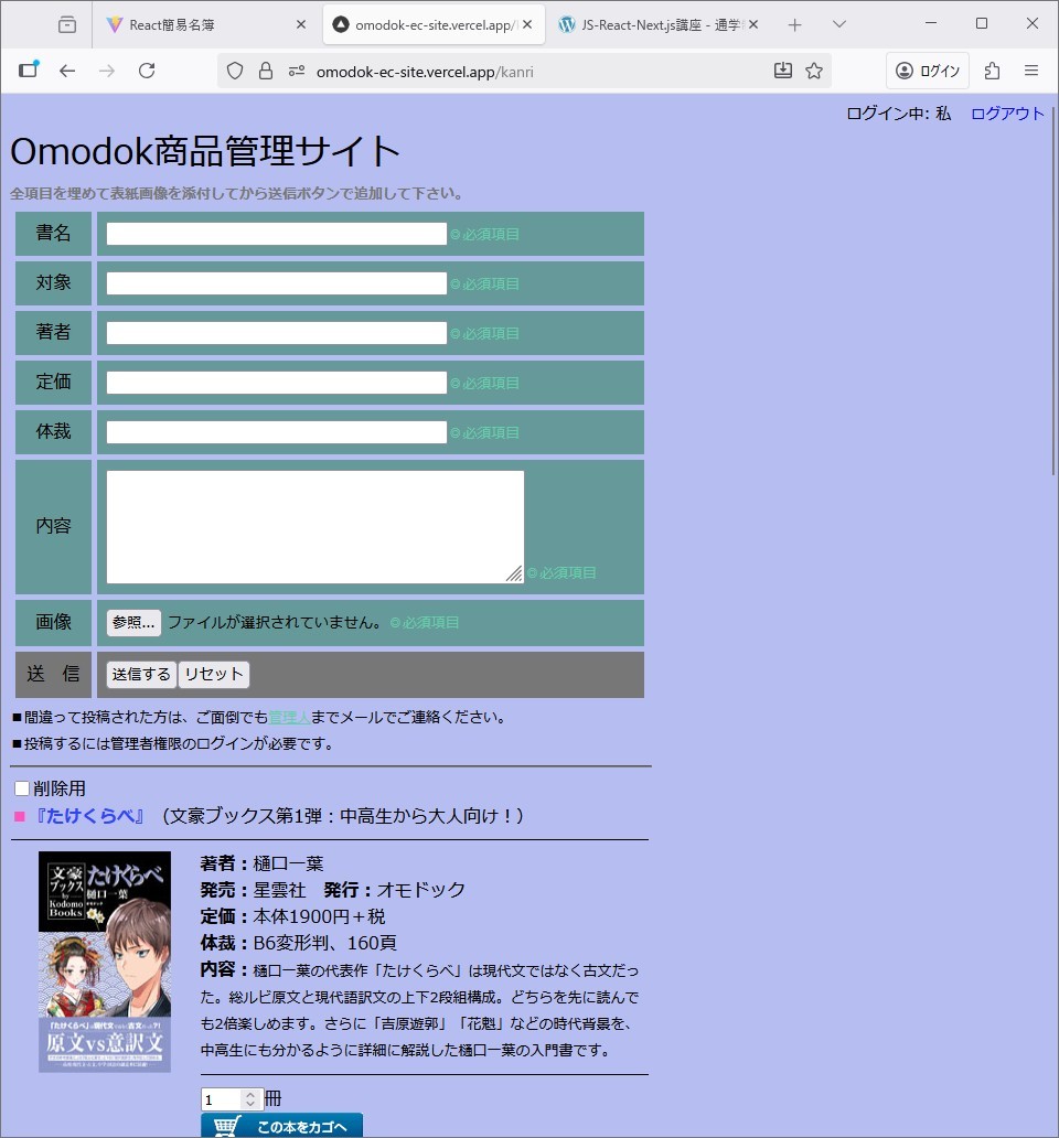 買い物カゴ付き書籍ショッピングサイトカート決済機能付きオーダーフォームロール権限者向け商品管理サイト